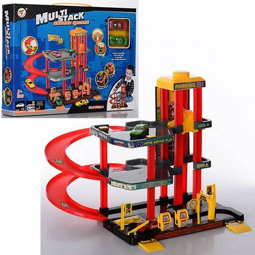 Гараж-паркинг игрушечный для мальчиков с 2-мя металлическими машинками в 3 этажа со спусками и лифтом для спуска