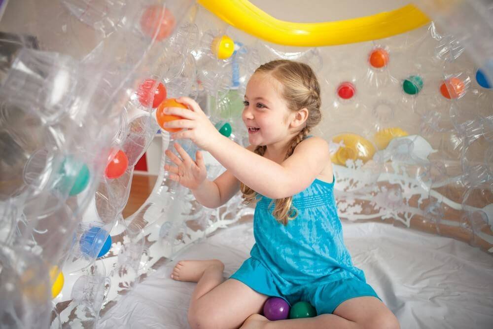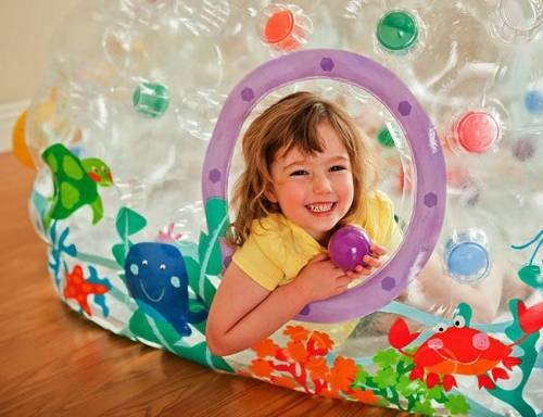 Детский надувной центр прозрачный с ярким изображением морских жителей. Игровой центр можно установить на свежем воздухе на даче, и использовать как бассейн. Можно играть в помещении без воды. Можно сложить игрушки для дальнего плавания.