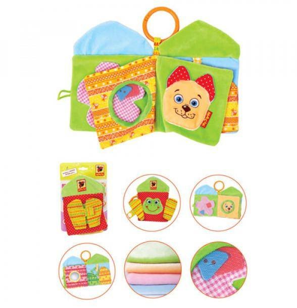 Каждая страничка содержит развивающие элементы: за яркими дверцами с липучкой спряталась лягушка, в цветочке можно перемещать пуговки, через окошко играть с собачкой в прятки. Надави на носик и собачка будет забавно пищать. Можно разглядывать себя в блестящее безопасное зеркальце. А яркую звезду прятать и доставать за хрустящими листочками.