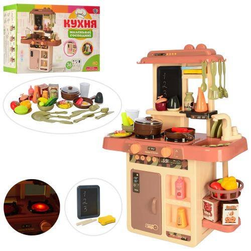 Кухня игровая с досточкой для рисования льется вода 889-188 коричневая - новая мдная кухня размером 63-45,5-22 см, в которой есть мойка, в ней механически льется вода, плита с видимостью готовки и паром, в комплекте есть посуда, продукты, досточка для рисования, мел, губка. Всего  42 предмета. Красивых, ярких и стильных.