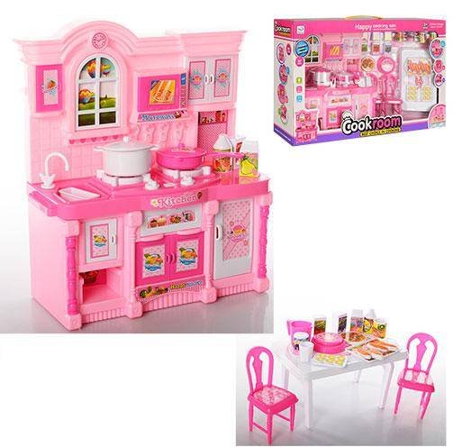 Мебель для кукол Кухня с музыкальными и световыми эффектами 5818 - розовая кухня со столом, посудой и продуктами.