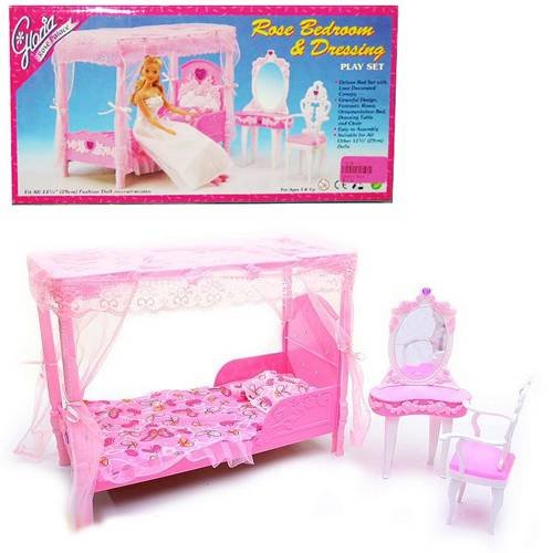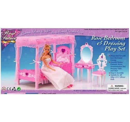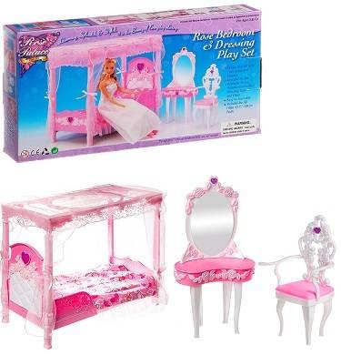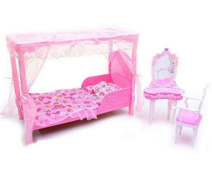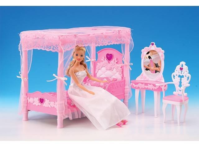 Мебель для кукол Спальная - чудесная спальная для кукол по типу Барби (до 29 см). В комплект входит кровать с балдахином, стул и трюмо. Вся мебель для кукол сделана в розовом цвете с красивой отделкой и нежным кружевным балдахином.