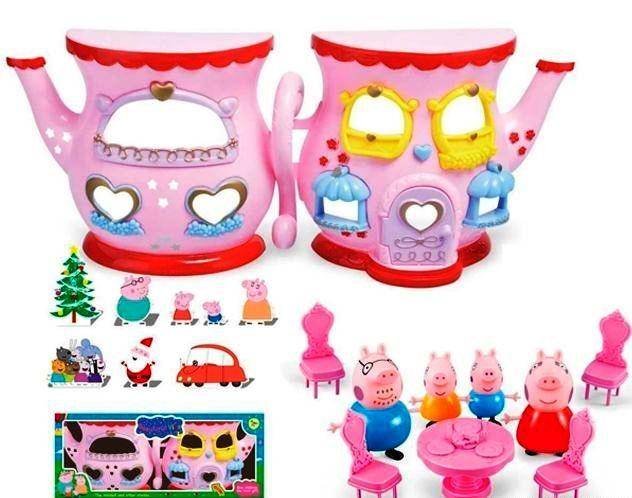 Свинка Пеппа Дом Чайник со звуками 666-006-1 - домик для Свинки Пеппы в виде чайника с мебелью и семьей. Фигурки с подвижными ручками и ножками. Милые фигурки. Папа и мама побольше, детки - поменьше.
