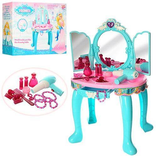 Трюмо детское с музыкальными и световыми эффектами LM90009A - при нажатии на кнопочку на зеркале проявляется картинка, все это сопровождается световыми и звуковыми эффектами.Зеркало красиво декорировано и выполнено из безопасных для ребенка материалов.В игровом трюмо много аксессуаров необходимых для маленькой модницы.В наборе есть фен, который реалистично гудит.В игрушке имеется выдвижной ящичек, чтобы складывать украшения.