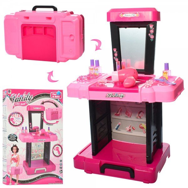 Трюмо детское в чемодане розово-черное Манифик 661-122 - эффектно трюмо для девочки, которое может компактно храниься в чемодане и быть украшением в детской комнате и любимой игрушкой любой девочки. В комплекте фен, который дунт воздухом