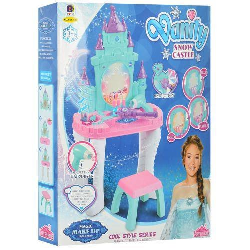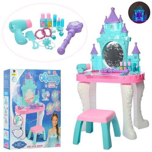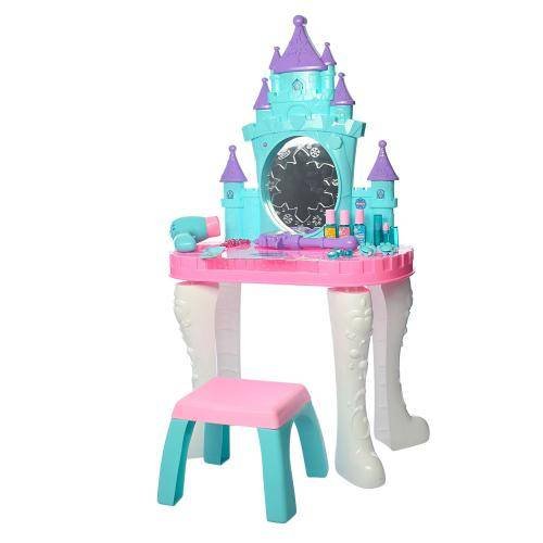 Трюмо для девочки Сказочный замок голубое 661-127 - в комплект входят трюмо, стульчик, фен, который дует воздухом, аксессуары. Трюмо с музыкой и светом в подарочной упаковке. Сказочный дизайн в виде замка сделает любую девочку настоящей принцессой