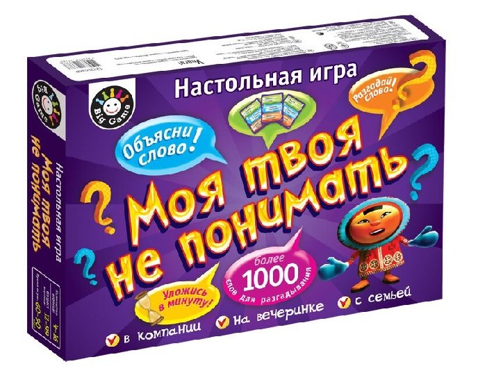 "Моя твоя не понимать" - увлекательная, динамичная командная игра в отгадывании слов. Беспроигрышный вариант для вечеринки. И не бойтесь, что кто-то из игроков будет скучать!